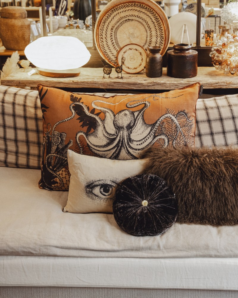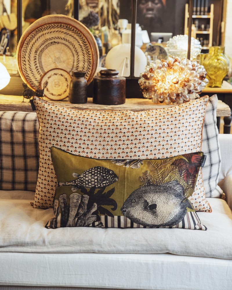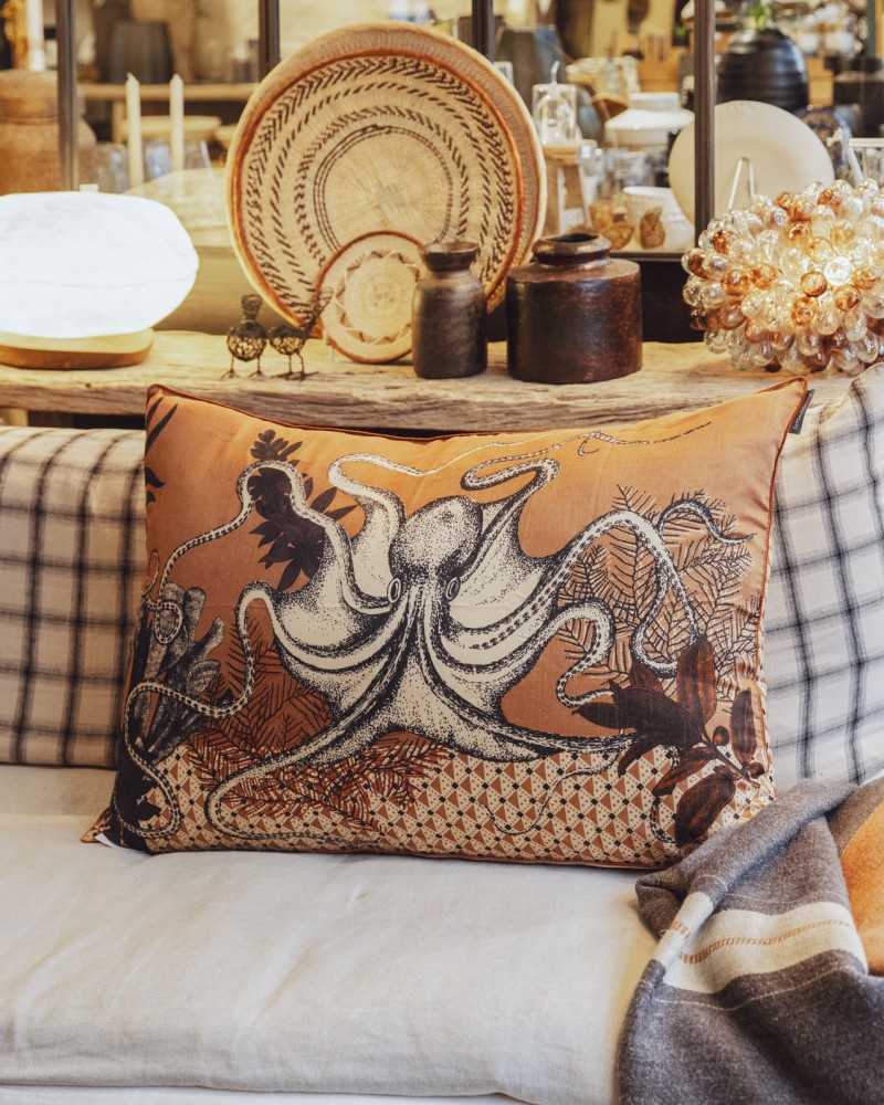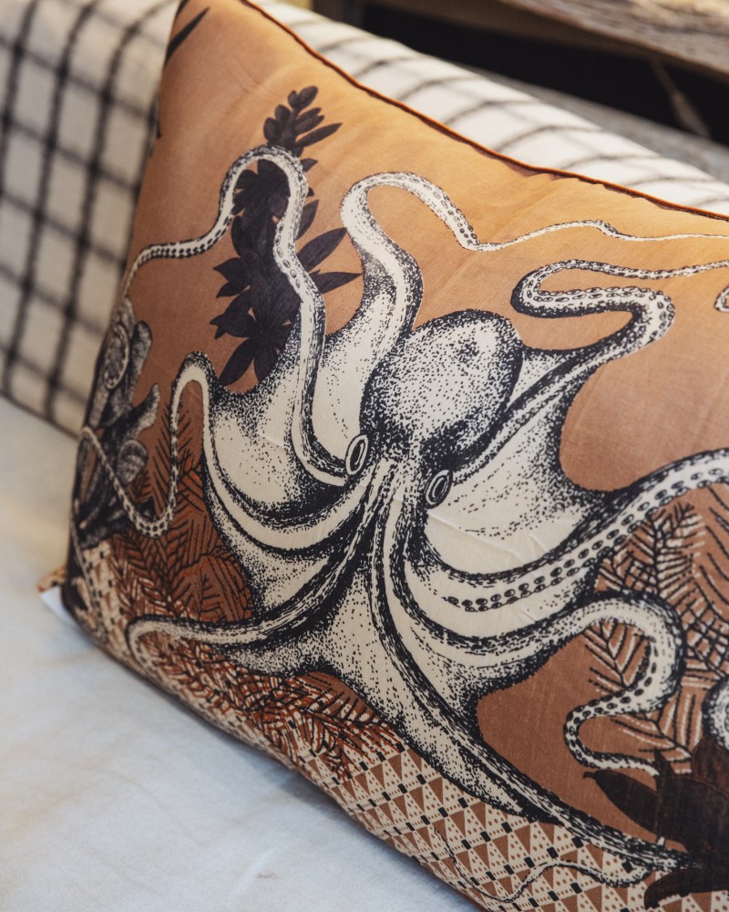 Géométrique et graphique, ce coussin XXL est un véritable tableau plein de couleurs et de détails, parfait pour apporter un twist unique et original à votre intérieur ! Entièrement fabriqué en soie brute non blanchie, le recto arbobre un imprimé unique représentant un octopus majestueux lorsque le verso est géométrique : parfait pour que vous le retourniez au grès de vos envies.