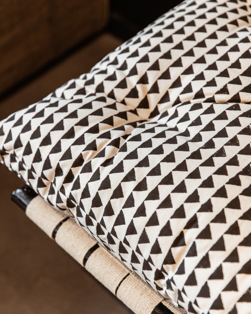 Graphique, son motif est imprimé avec la technique du "block-print", lors de laquelle des blocs de bois sont utilisés pour venir imprimer le tissus. Cela donne des irrégularités uniques que l'on adore.