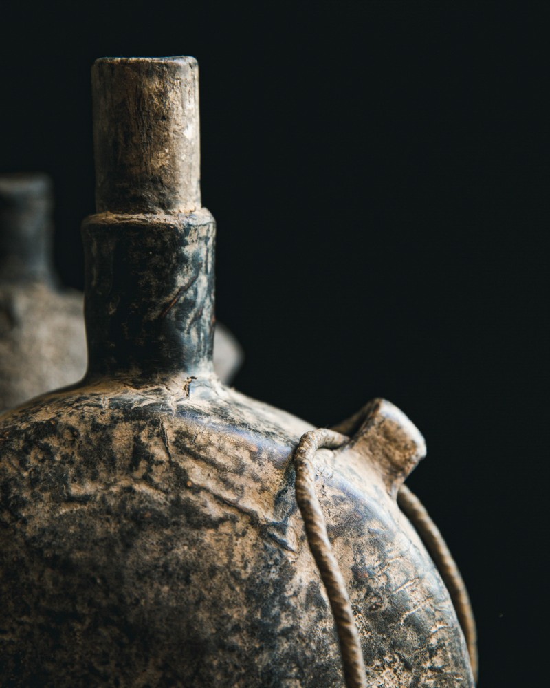 Véritable pièce de collection, cette gourde ancienne de Mongolie date du début du 20ème siècle et servait aux peuples nomades à transporter différents liquides. Aujourd'hui transformée en objet de décoration, elle se collectionne seule ou en série et ajoute un supplément d'âme à un intérieur ethnique ou plus contemporain, où ses irrégularités seront mises en valeurs.