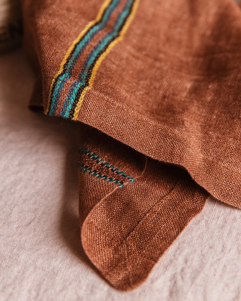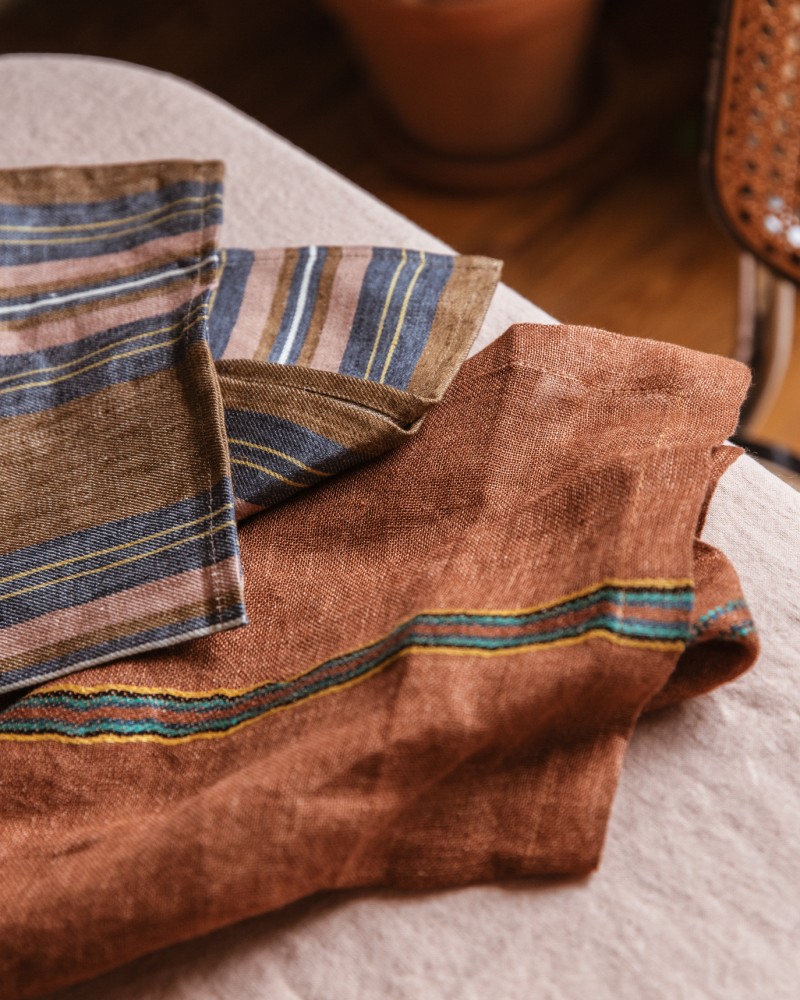 Cette serviette de table à la texture très fine et ajourée est délicate, colorée et contrastée. En effet, sa couleur terracotta est rehaussée par les fines rayures composées de bleu, vert, noir et jaune.