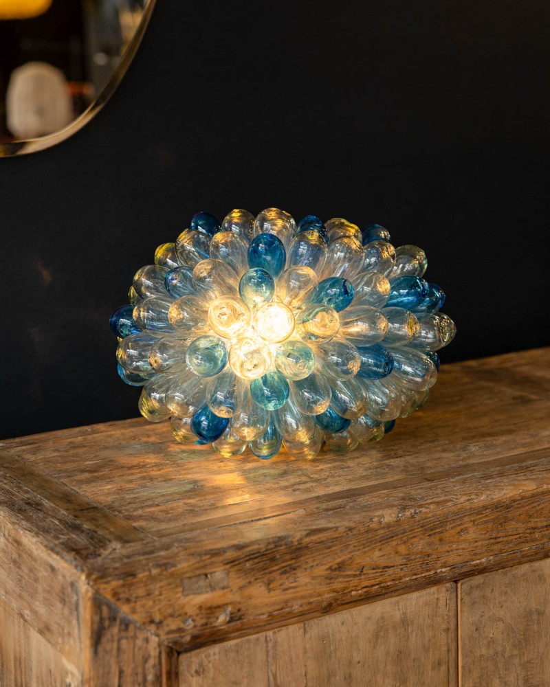 Chaque lampe Grappe est unique ! En effet, les gouttes de verre sont soufflées à la bouche à partir de verre recyclé par des maîtres verriers syriens, elles sont ensuite tissées dans leur atelier. Ce qui les rend toutes uniques.