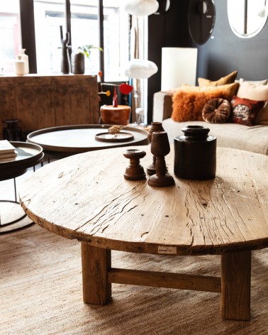Cette table Tofu en orme est une ancienne table qui était surmontée d'une meule en pierre qui servait à broyer le soja pour en faire du tofu. Datant du début du 20ème siècle, cet ancien meuble chinois est entièrement d'origine. C'est une pièce ancienne que nous avons sélectionnée pour l'aspect de son bois. Les pieds en orme ont été dimensionnés pour supporter le poids de la meule. Cette table est une pièce unique, elle se marie parfaitement avec un univers contemporain ou plus bohème.