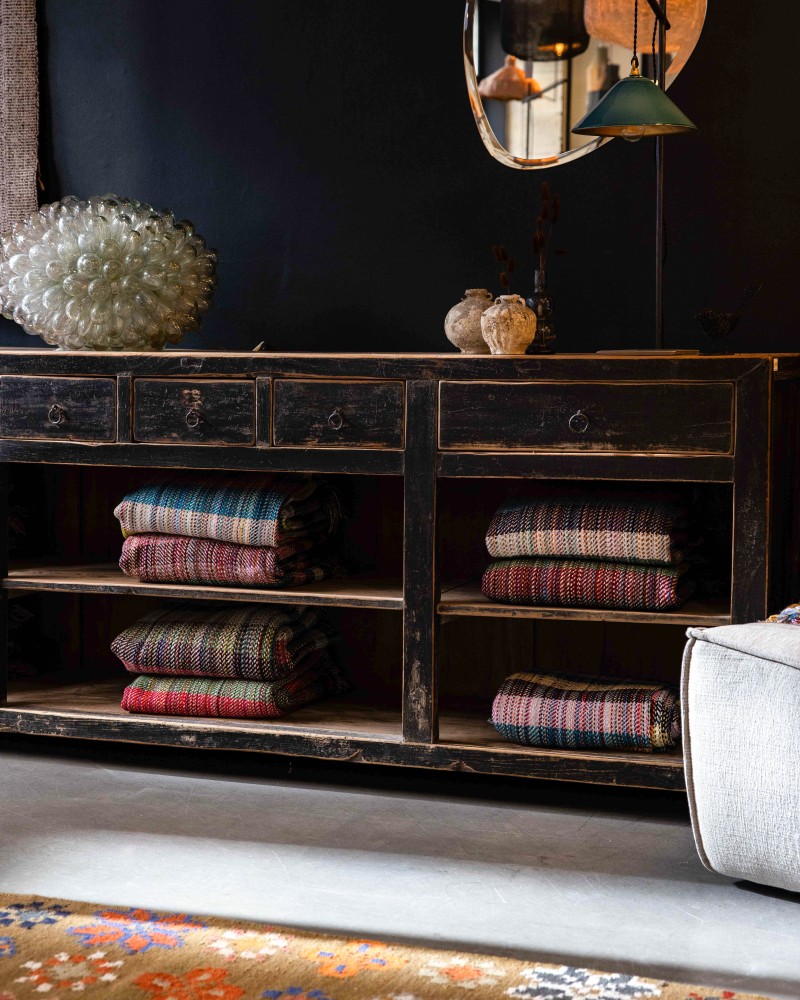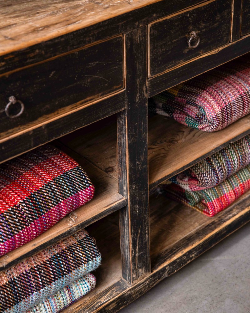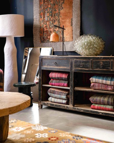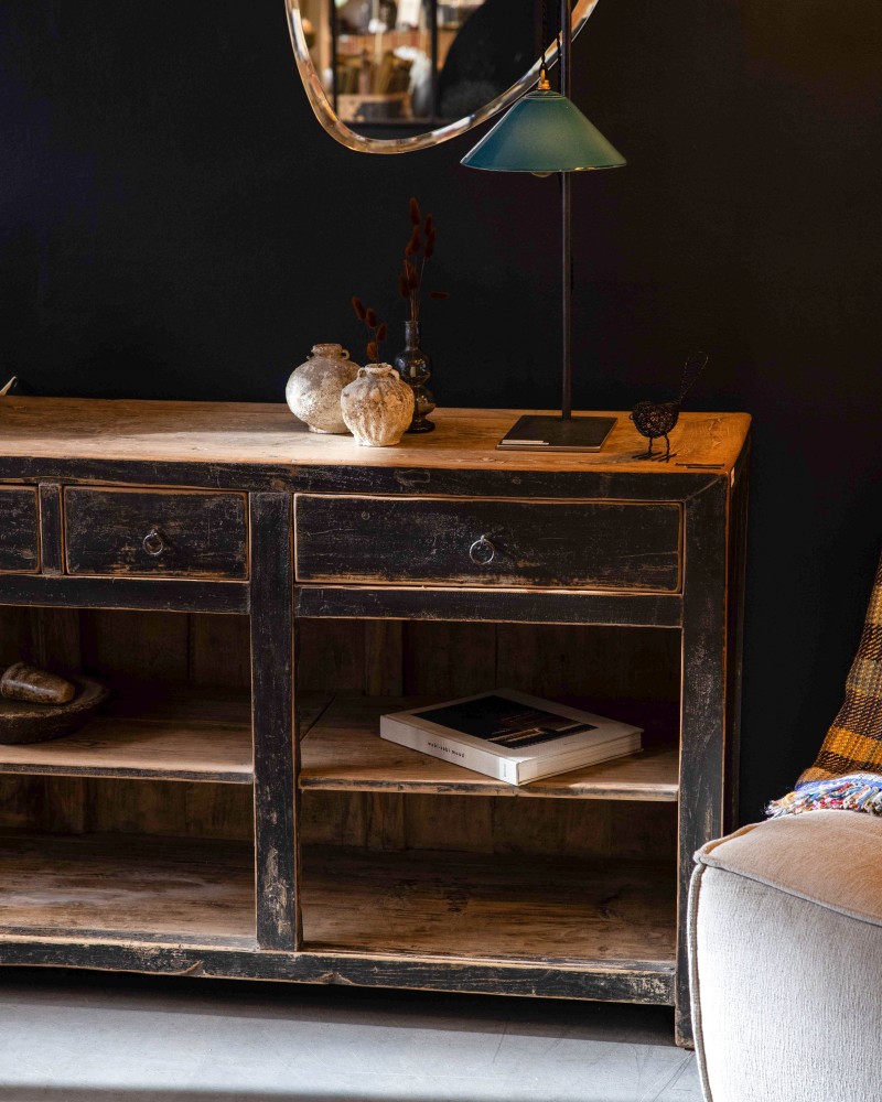 Celui-ci appartient à la seconde catégorie. Ramené de Chine, issu vraisemblablement d'une maison bourgeoise du début du XXe siècle, ce meuble en orme massif porte en lui plusieurs décennies de vie quotidienne. Ses 5 tiroirs asymétriques aux formats différents, organisés sur deux plateaux, lui confère toute sa particularité et laisseront libre court d'usage à celui qui l'intègrera dans son intérieur.
