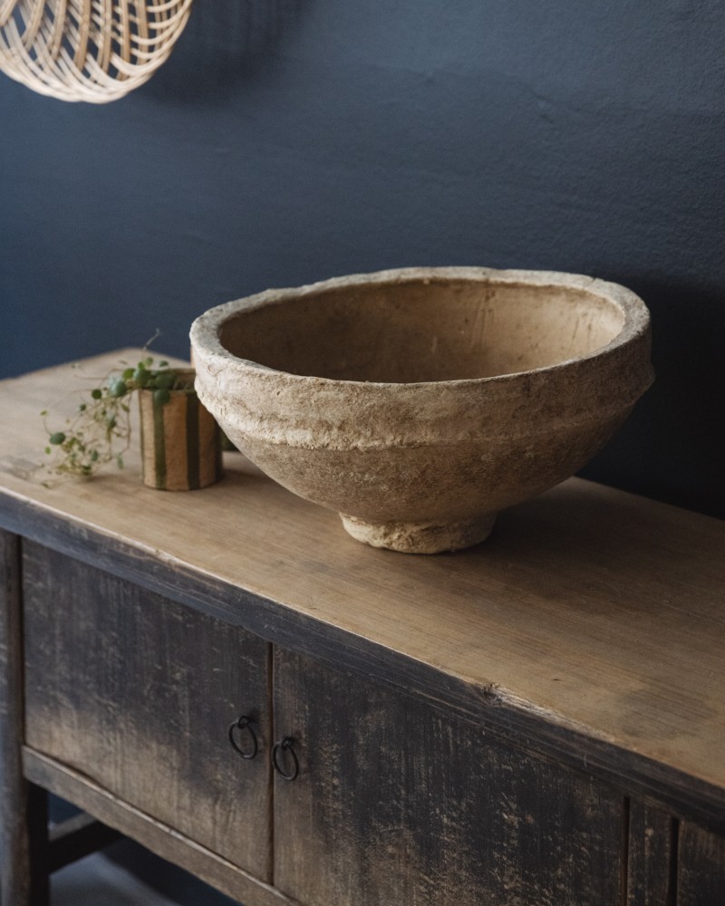 Cette ancienne coupe en papier mâché vient de la région du Gujarat en Inde. Fabriquée à la main chaque coupe est unique, la couleurs, les finitions et la taille peuvent varier d'une coupe à l'autre.