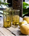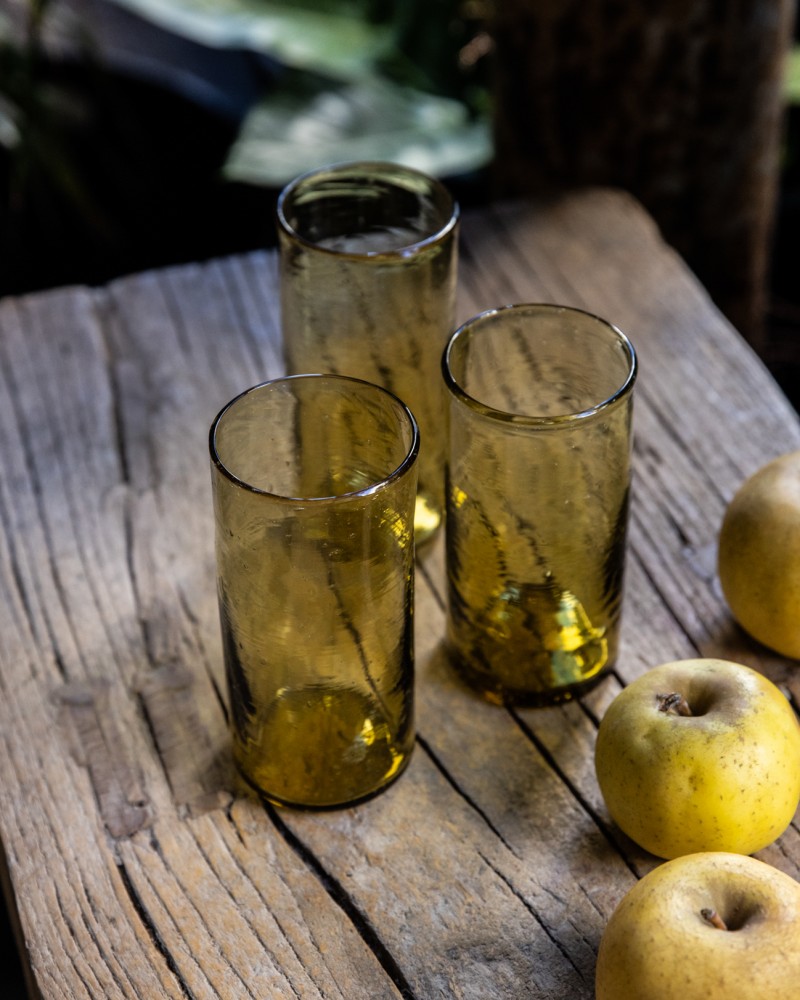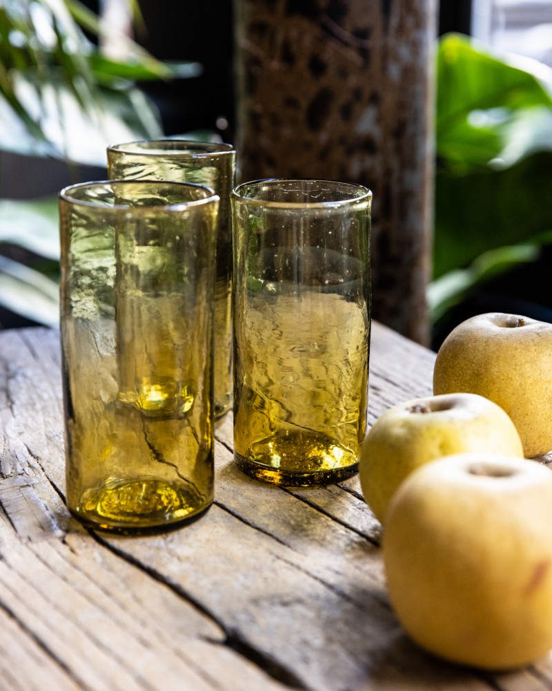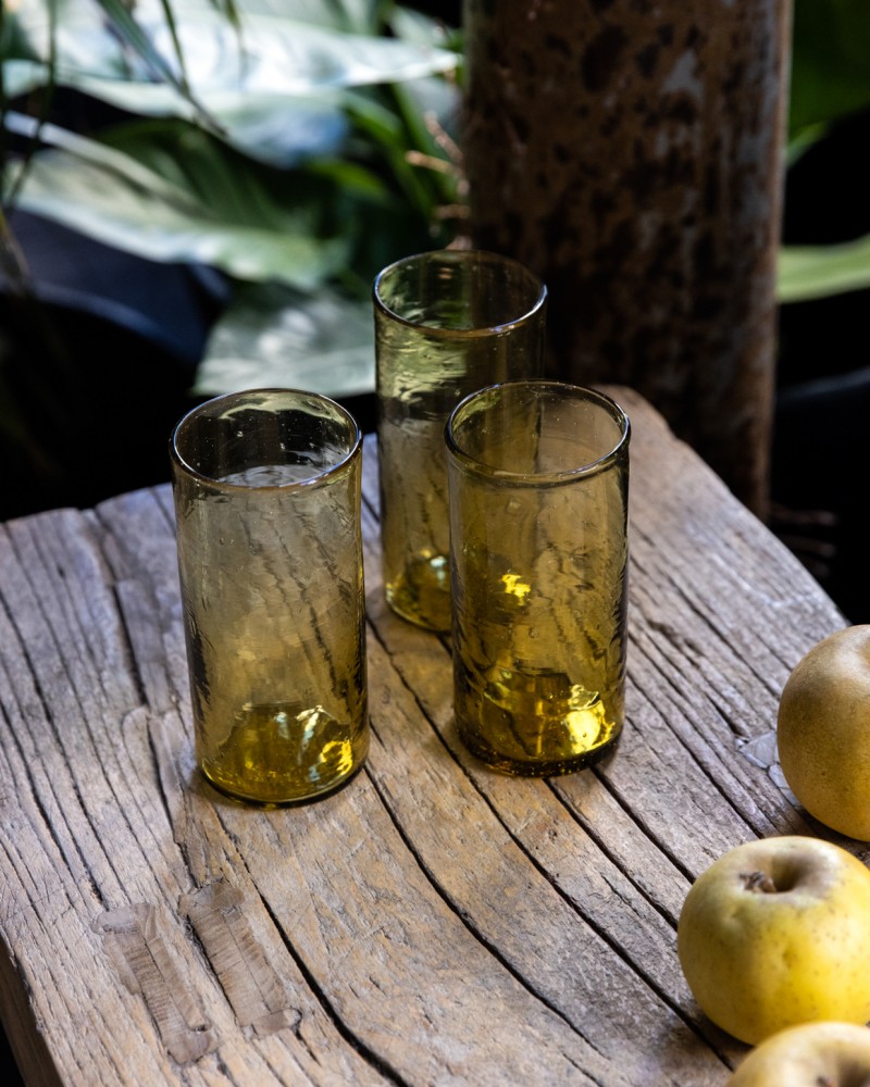 Ces grands verres droits sont soufflés bouche par des artisans syriens et issus du commerce équitable. À l'empreinte visuelle singulière, ils sont parfaits pour ajouter une touche de matière et de couleur sur une table. À mixer avec une vaisselle fine, la beauté de leur design singulier ressort et met également votre vaisselle en avant.