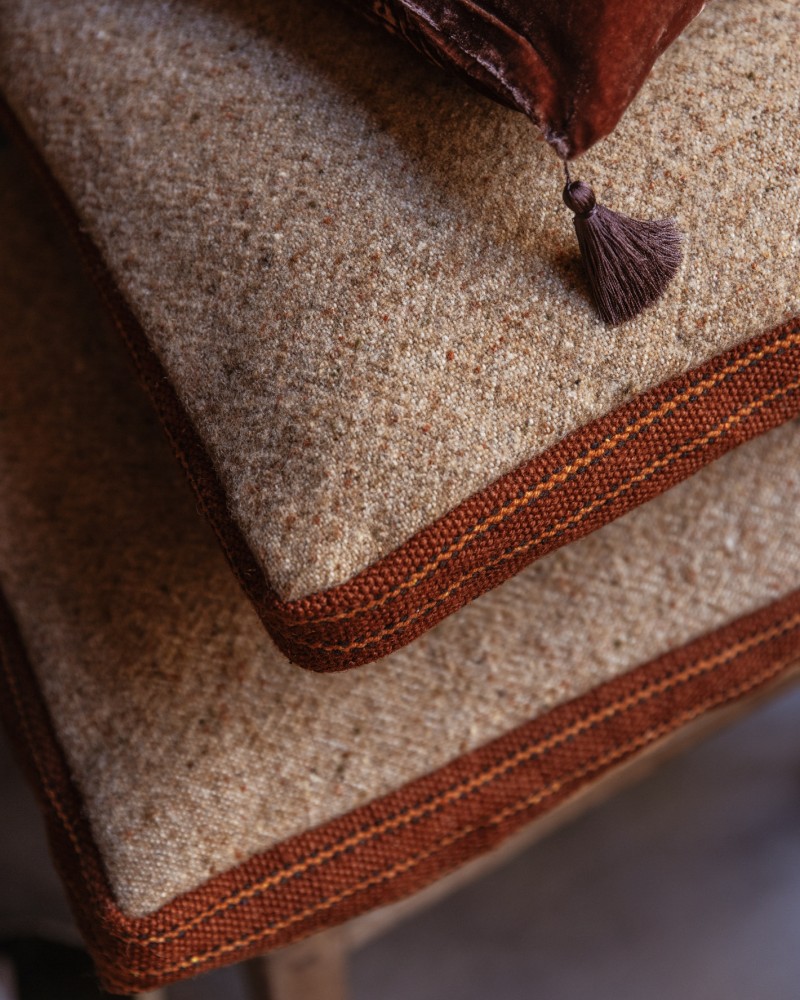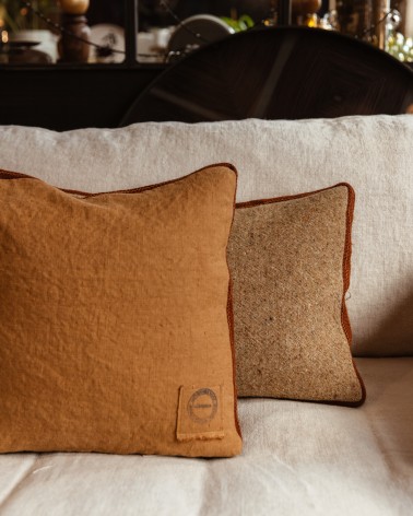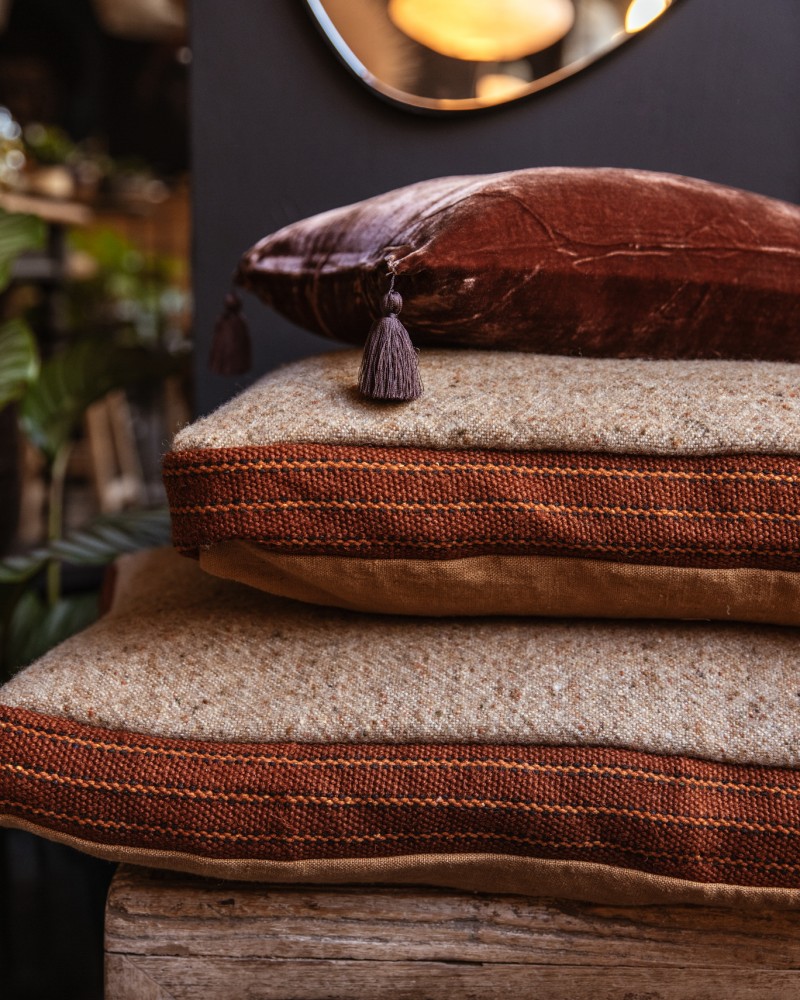 Fruit de la collaboration entre la maison belge Simples et Maison SERSK, ces coussins sont faits à la main à partir de tissus haut de gamme initialement destinés à des collections de prêt-à-porter. Beauté du mélange des matières délicates et brutes, le contraste entre le recto et le verso apporte une touche colorée sur un canapé ou un lit. La ganse en jute vient rehausser et lier avec harmonie les 2 côtés.