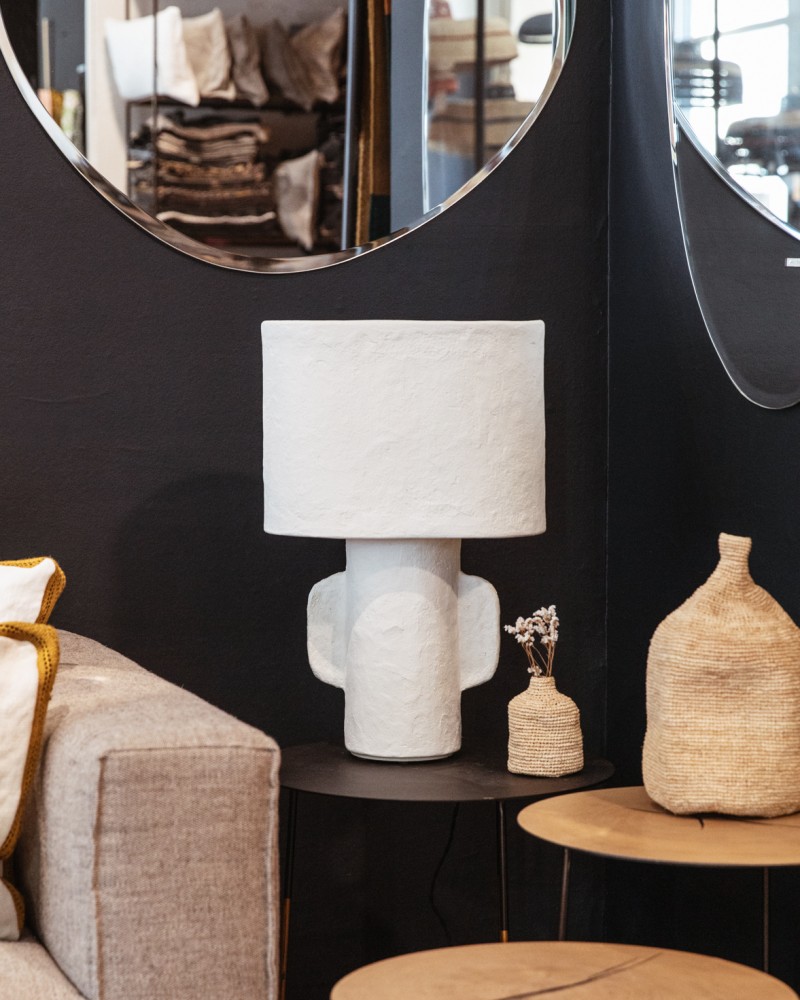 La créatrice Marie Michielssen livre ici pour le studio de design belge Serax une lampe de table originale et déjà iconique. Sa forme et sa matière, le papier mâché, lui donnent un aspect irrégulier qui en fait un objet éclectique, à placer dans un univers contemporain ou plus bohème. La couleur naturelle du papier mâché, que la créatrice voulait conserver pour ne pas dénaturer la matière de la lampe, en fait un objet chaleureux, idéal pour ajouter un point de lumière à un intérieur.