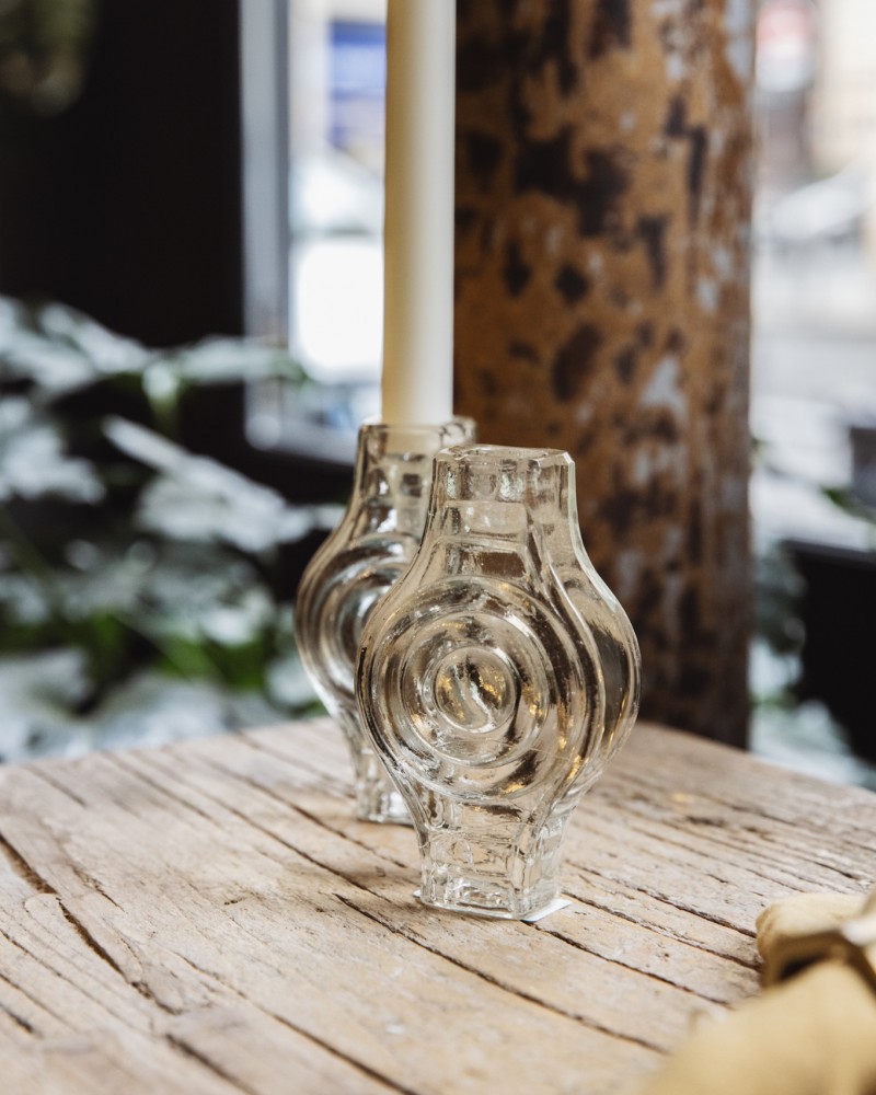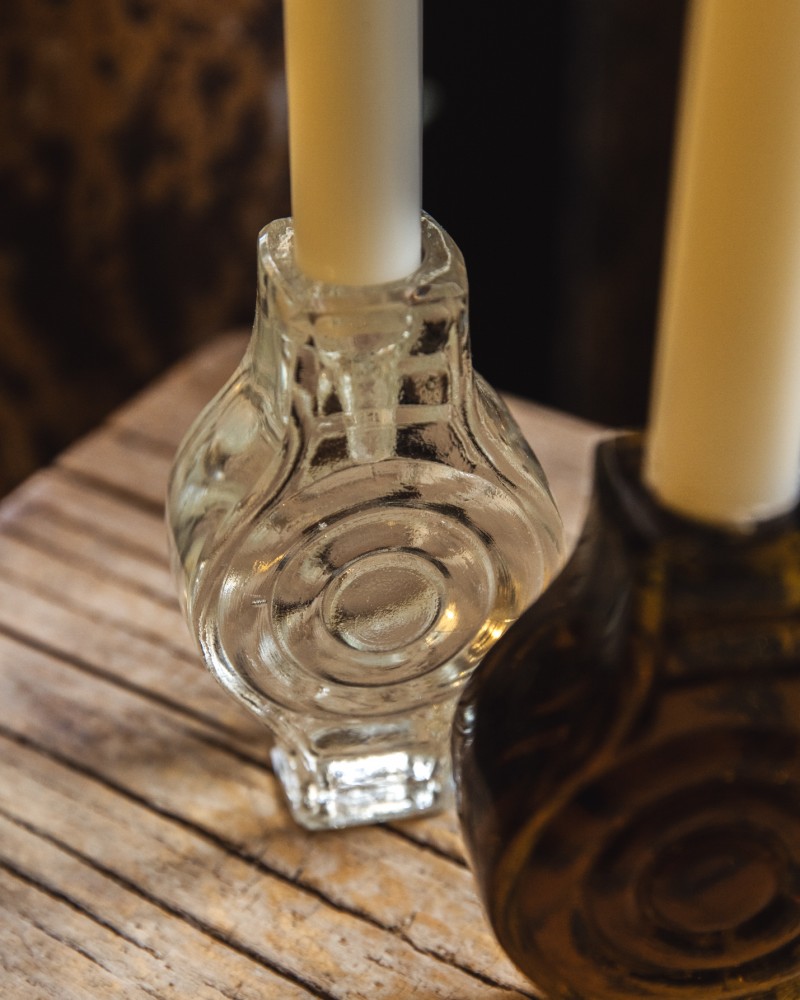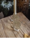 Ce bougeoir pressé à la main est fabriqué à partir de verre recyclé. On adore son côté brut, il peut être installé en accumulation sur une cheminée ou un centre de table pour un effet festif.