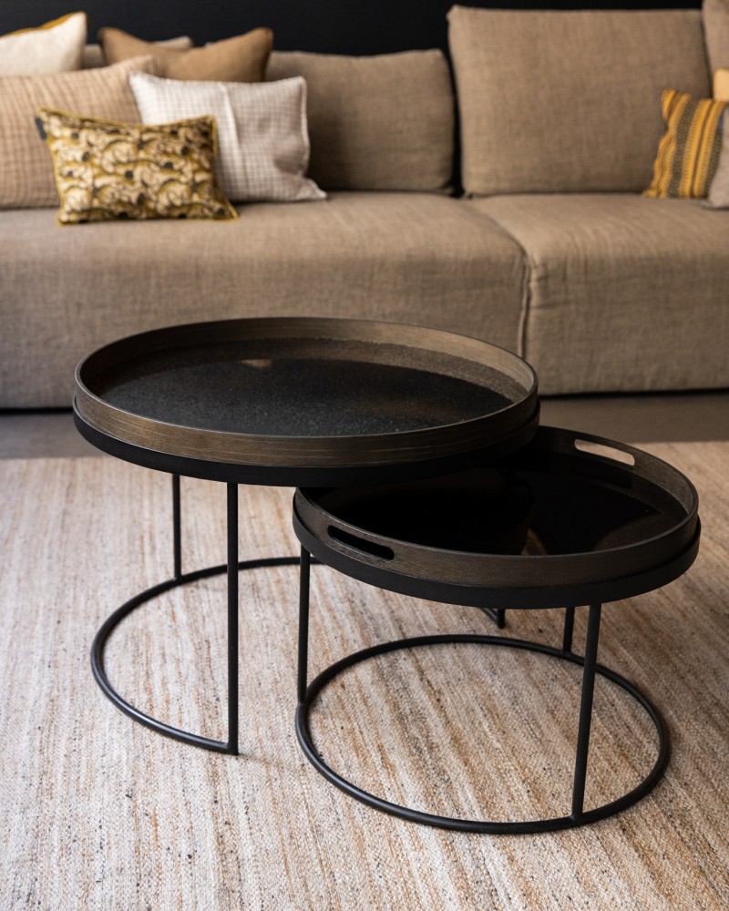 Les structures gigognes permettent de ranger une table sous l'autre en un clin d'oeil, et d'avoir si besoin une table amovible. Les structures ont un piètement en métal fin et noir.